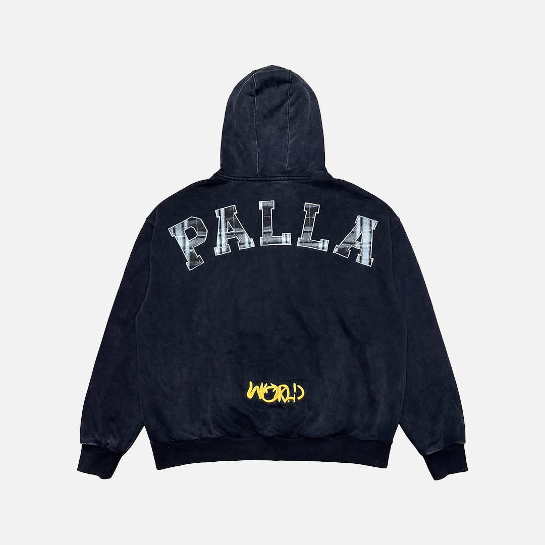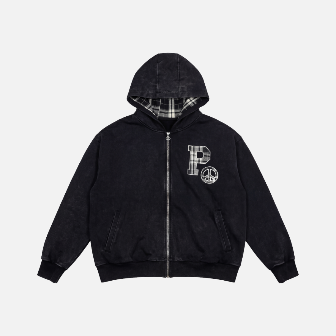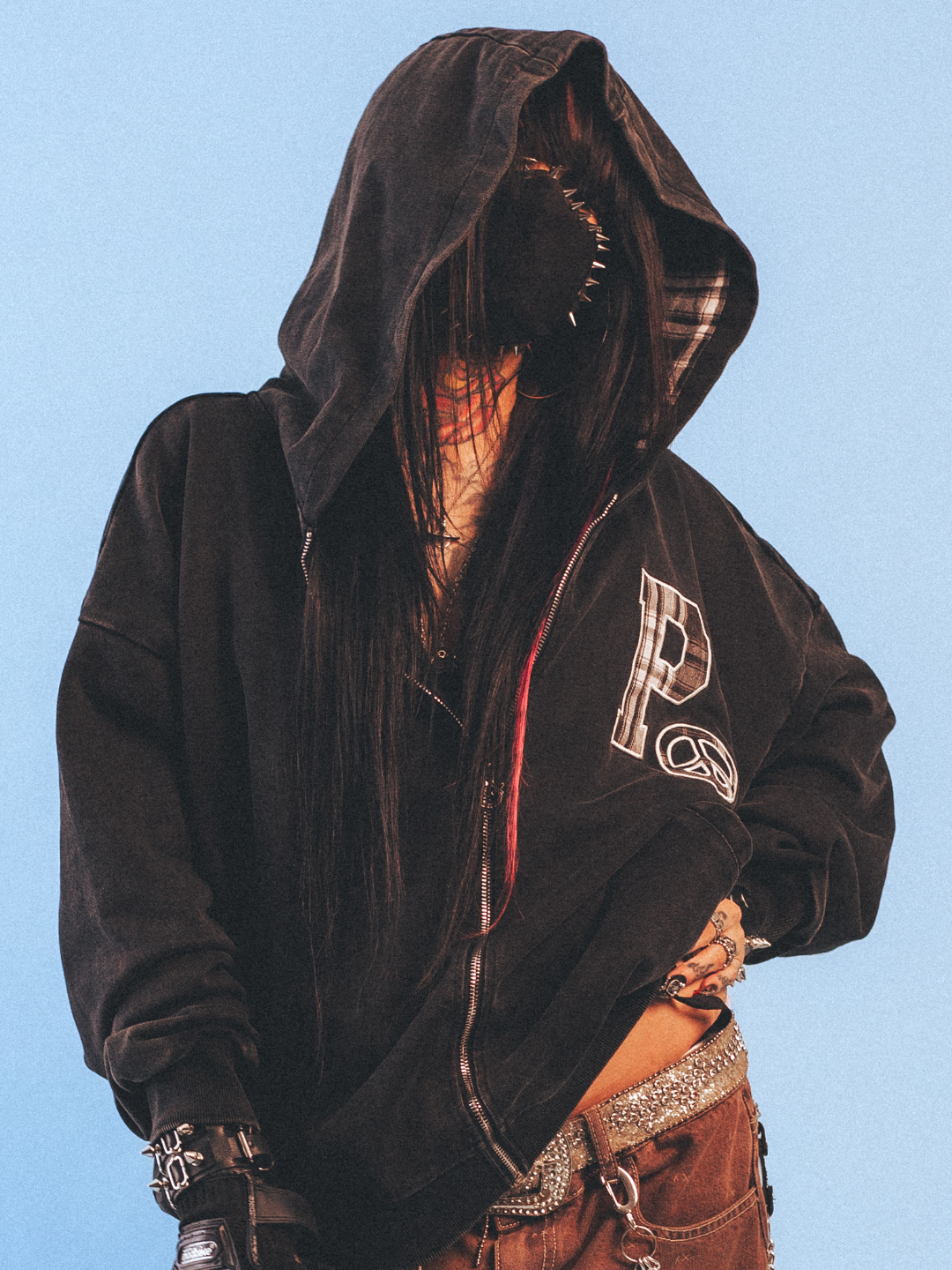 A peça passa por processo de lavagem que confere ao preto uma aparência de desgaste sutil. Os patches em padrão xadrez preto e branco são costurados diretamente na peça, enquanto o mesmo padrão aparece no forro da touca, reforçando a coerência visual. O bordado nas costas, em amarelo, finaliza o design com contraste e destaque controlado.