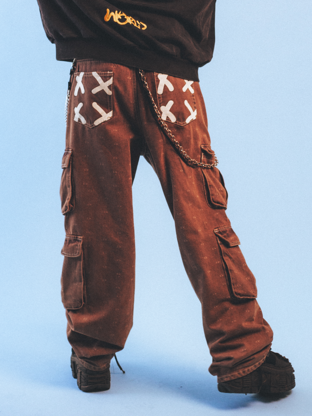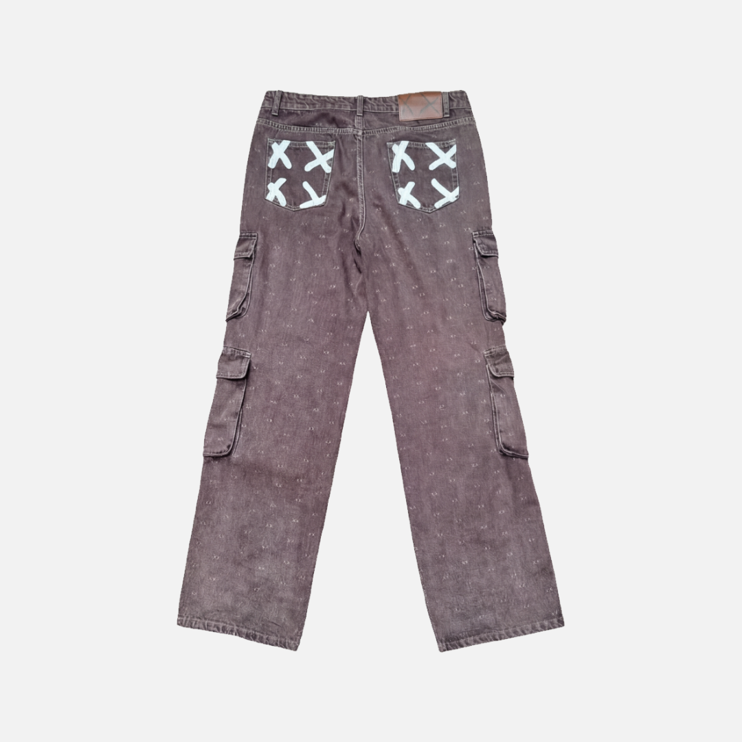 O design é marcado pelos quatro bolsos laterais e pelo padrão de monograma XX, com estampas aplicadas em silkscreen nos bolsos traseiros, reforçando a identidade visual da coleção. Modelagem confortável, com caimento solto e construção precisa para o uso diário.